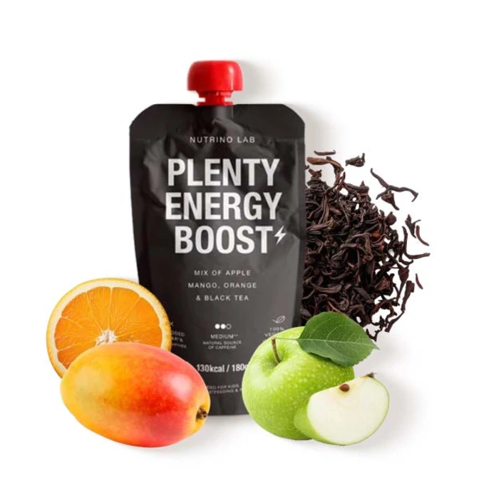 Nutrinolab Plenty Energy Boost, Elma, Mango ve Portakalın canlı meyve aromalarını Çin geleneğinin ürünü olan Siyah Çay ile buluşturan, tamamen doğal ve sağlıklı bir atıştırmalıktır; ölçülü kalori değeri (130 kcal/180 g) ile size düşük kalorili bir seçenek sunarken, siyah çaydan gelen 31 mg doğal kafein sayesinde uyanıklığı ve odaklanmayı destekler.