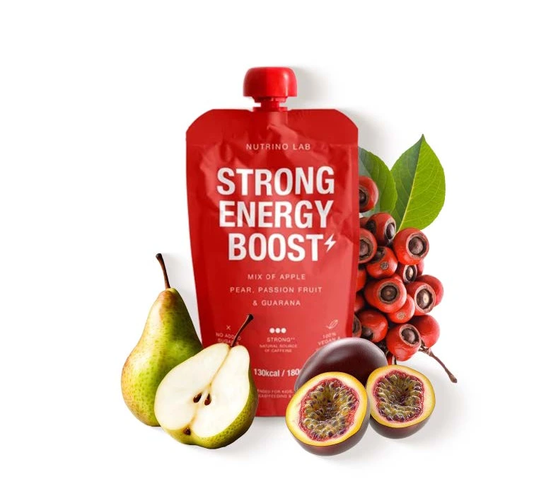 Nutrinolab Strong Energy Boost, Amazon yağmur ormanlarının güçlü bitkisi guarana (Paullinia cupana) ile elma, tropikal meyveler ve doğal aromaları bir araya getirerek yoğun enerjiye ihtiyaç duyduğunuz anlarda sağlıklı bir destek sunar; ölçülü kalori değeri (130 kcal/180 g) ile hafif bir atıştırmalık olmasının yanı sıra, guaranadan gelen 58 mg doğal kafein ve diğer ksantin alkaloidleri sayesinde uyanıklığı artırır, yorgunluğu azaltır ve fiziksel dayanıklılığı destekler.
